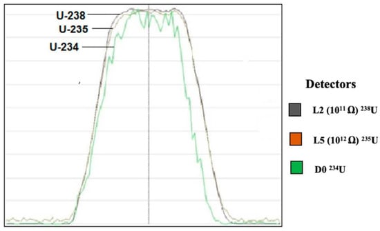 The U concentration in the sample was in µg mL−1 range. Therefore, wet plasma mode has been employed for U isotope (234U/238U and 235U/238U) ratio measurement. The maximum intensity of U isotopes in 50 ng mL−1 were 3.6 V, 0.023 V and 11500 cps for 238U, 235U, and 234U, respectively. 234U/238U and 235U/238U isotope ratios were calculated as the mean ratio of 150 replicates with an outlier test that was implemented in Nu plasma 3D instrument software (Nu Instruments Calculation Editor-NICE). The values that deviated from the mean by more than two-sigma were considered as outliers. The multi scan of U isotopes peak shape and peak coincidence are shown in Figure 3. The exponential fractionation law has been used for internal mass bias correction.