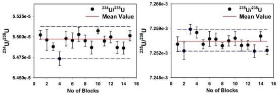 where R is the U isotope ratios for seven different dates, and M is the mean of all U isotope ratios for the in-house standard. UR and UM are the uncertainties on the U isotope ratios for seven different dates and the mean U isotope ratio for the in-house standard, respectively. If AD ≤ 1.96UAD, then the U isotope ratios measured on seven different dates and the mean U isotope ratio for in-house standard in this study are equal as well as accepted as ‘precise’ with a confidence interval of 95%. All the U isotope ratios measured on seven different dates showed AD values less than 1.96UAD and were within the error range. No larger isotopic variations were observed among the seven different dates and the mean U isotope ratio for the in-house standard. The mean of seven different measurements for the in-house standard was compared with the natural U isotope ratios for the accuracy. They are found to be in good agreement. The calculated relative bias (RB) for 234U/238U and 235U/238U isotope ratios of the in-house standard was less than 10% of the maximum acceptable relative bias (MARB) []. The internal precision obtained for 234U/238U and 235U/238U isotope ratios was 3 and 0.01 ppm, respectively. From this, it is illustrated that the U isotope ratio measurement using MC-ICP-MS is accurate and precise.