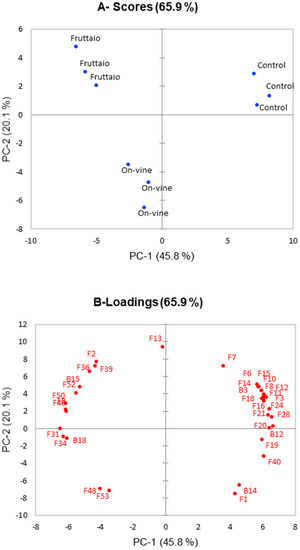 Principal component analysis (PCA) showed that 65.9% of the total variance was explained by the first and second component (Figure 1). In fact, first principal component (PC-1) explained 45.8% of the total variance, while PC-2 explained 20.1%. Samples were separated into three clusters according to their withering technique. PC-1 mostly discriminated withered samples from not-withered. Control samples were characterized principally by esters, fatty acids, C6 compounds 1-hexanol, trans-3-hexenol, and cis-3-hexenol precursor. Instead withered compounds were characterized by terpenes like β-citronellol, linalool, terpinen-4-ol, 1,4-cineole; by the norisoprenoid 3-oxo-α-ionol; and by several benzenoids like phenylethyl alcohol, benzyl alcohol, methyl vanillate and its glycosidic precursor. PC-2 permitted to discriminate on-vine from fruttaio samples, the major drivers of this diversity were the ethyl butanoate, ethyl decanoate, ethyl vanillate, and the bound precursor of geraniol.