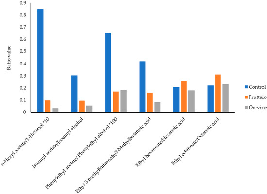 - Antalick, G.; Suklje, K.; Blackman, J.; Meeks, C.; Deloire, A.; Schmidtke, L.M. Influence of grape composition on red wine ester profile: Comparison between cabernet sauvignon and shiraz cultivars from australian warm climate. J. Agric. Food Chem. 2015, 63, 4664–4672. [Google Scholar] [CrossRef] [PubMed]