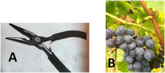 Plier for the peduncle twist (A), and grape after peduncle twist (B). Photo courtesy of Masi.