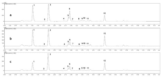 High-performance liquid chromatography (HPLC) chromatogram (monitored at 276 nm) of herb extracts obtained from plants grown: (a) in full sunlight; (b) in 30% shade; (c) in 50% shade. The following compounds were analyzed: (1) chlorogenic acid; (2) caffeic acid; (3) o-coumaric acid 2-O-glucoside; (4) p-coumaric acid; (5) verbascoside; (6) luteolin 7-O-glucoside; (7) ferulic acid; (8) 3,4-dihydroxycoumarin; (9) cichoric acid; (10) apiin; (11) o-coumaric acid; (12) coumarin.