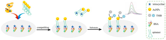 The analysis principle of the research was the indirect competition method, i.e., the analyte-protein conjugate was fixed, and the aptamer and free analyte were in the solution. The fixed analyte competed for the limited aptamer with the free analyte. Finally, the quantitative analysis was achieved through the color development of AuNPs catalysis substrate. The illustration of the proposed analytical procedure is shown in Figure 1. Firstly, the 5′-end sulfydryl modified tetracycline-aptamer-labeled gold nanoparticles (aptamer-AuNPs) were acquired by Au-S covalent bond, with the features of tetracycline recognition function and catalytic property of nanozyme. Then, tetracycline was fixed on BSA to generate the conjugate (tetracycline-BSA), which was subsequently used to coat the bottom of a microplate. The microplate is a high binding type with polystyrene as the carrier, which can improve the sensitivity, thus reducing the concentration and dosage of coating protein, but it is easy to produce non-specific adsorption, so another protein needs to be treated as a blocking agent. After blocking by casein solution, aptamer-AuNPs, and honey samples were added into the wells of a microplate. This enabled a competitive binding with the limited amount of aptamer between fixed tetracycline in the microplate and free tetracycline in the sample. The result of the competition is that aptamer-AuNPs bound with free tetracycline were removed, while aptamer-AuNPs bound with tetracycline-BSA were combined on the microplate. The horseradish peroxidase-hydrogen peroxide–3,3′,5,5′–tetramethylbenzidine (HRP-H2O2-TMB) colored system is commonly used in ELISA [35]. AuNPs were used to replace HRP in this work. AuNPs have been reported to have peroxidase activity and could catalyze hydrogen peroxide to a generate hydroxyl radical. Further reaction of hydroxyl radical could oxidize the colorless substrate (TMB) to its blue oxidized product, thus achieving the quantitative measurement at 652 nm. The peroxidase activity of AuNPs was obstructed to a certain extent due to the surface modification by the aptamer. Therefore, gold seed growth solution was used to generate gold shell sediments with larger surface area to obtain a better catalysis effect. Larger amounts of free tetracycline in the sample were associated with more competitive binding of aptamer-AuNPs, less aptamer-AuNPs binding with tetracycline-BSA, and a lighter final color. The depth of the color can be converted to a quantitative value by an ultraviolet spectrophotometer. As a result, the content of tetracycline in the sample was in negative correlation with the color depth.
