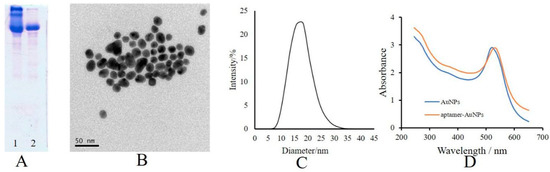 Results of material characterization: (A) SDS-PAGE of BSA and tetracycline-BSA; (B) TEM image of aptamer-AuNPs; (C) particle size distribution of aptamer-AuNPs; (D) UV–vis spectra of the AuNPs and aptamer-AuNPs.