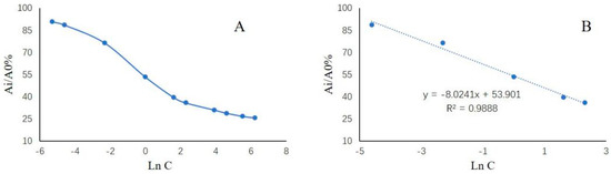(A) Relative absorbance of the designed analytical method as a function of the logarithm of concentration. (B) Tetracycline standard curve.