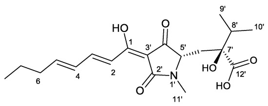 The absolute configuration S,S at the asymmetric carbons C-5′ and C-7 of harzianic acid was assigned by X-ray diffraction studies [21]. Moreover, harzianic acid and its stereoisomers were also prepared in six steps with an overall yield of 22% from the masked 4,4-disubstituted glutamic acid and a polyene fragment [22].