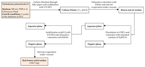 Mycelial plugs from actively growing cultures on PDA of strain L1 were used to inoculated in 1 L-Erlenmayer flasks containing 500 mL PDB. Cultures were kept in darkness at 25 °C for 3 weeks, then filtered through filter paper (Whatman, Maidstone, UK). The culture filtrate (1 L) was acidified to pH 2 with 2 N HCl and extracted three time with the same volume of ethyl acetate (EtOAc). The organic extracts were combined, dried with Na2SO4, and evaporated under reduced pressure to give a brown-red oil residue. The extract was dissolved in CHCl3 and then extracted with a saturated solution of NaHCO3. The aqueous phase was acidified at pH 2 with concentrated HCl and extracted three times with EtOAc. The organic phase obtained was dried with Na2SO4, and evaporated under reduced pressure affording a red-brown solid residue (150.7 mg) (Figure 2).