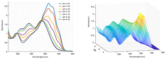UV-VIS spectra as a function of pH for a solution 2.0 × 10−4 M harzianic acid in CH3OH/0.1 M NaClO4 (50:50 w/w) recorded at pHs: 3.03, 3.58, 4.20, 4.70, 5.70, 6.66, 8.50 (left 2D–right 3D graphics).