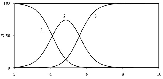 Distribution diagram of protolytic species for harzianic acid in CH3OH/0.1 M NaClO4 (50:50 w/w) (1: H2L; 2: HL−; 3: L2−).