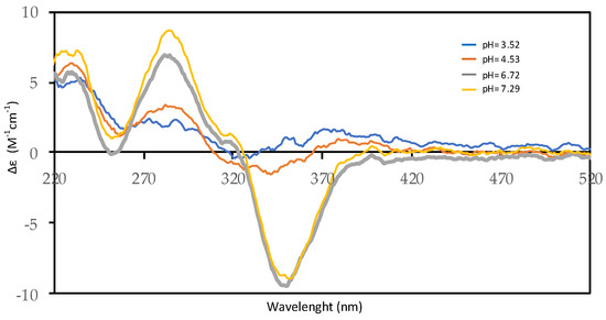 Circular dichroism measurements, conducted in the same conditions as potentiometric and spectrophotometric assessments, show, as the pH of the solution increases, the presence of two peaks (one positive Cotton effect at 285 nm and another negative at 350 nm) as reported in Figure 5. This behavior indicates an increase in the asymmetry of the molecule in alkaline solution, which affects the chirality in position C5′. In effect, by a keto–enolic equilibrium, that involves the carbonyl group in C4′, it is possible to invert the configuration in C5′.