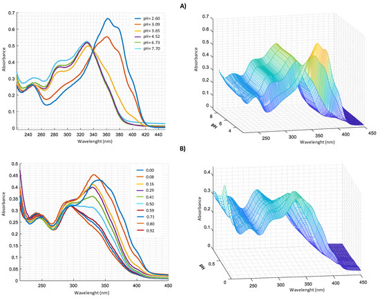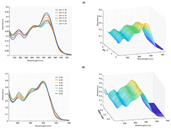 UV–VIS spectra in CH3OH/0.1 M NaClO4 (50:50 w/w of: (A) 2.0 × 10−4 M harzianic acid and 2.0 × 10−4 M Zn(ClO4)2 at different pH (2.60; 3.09; 3.65; 4.52; 6.73; 7.70); (B) at different metal/harzianic acid molar ratio (0.08; 0.16; 0.29; 0.41; 0.50; 0.59; 0.71; 0.80; 0.92) at pH = 6.50 (left 2D–right 3D graphics).