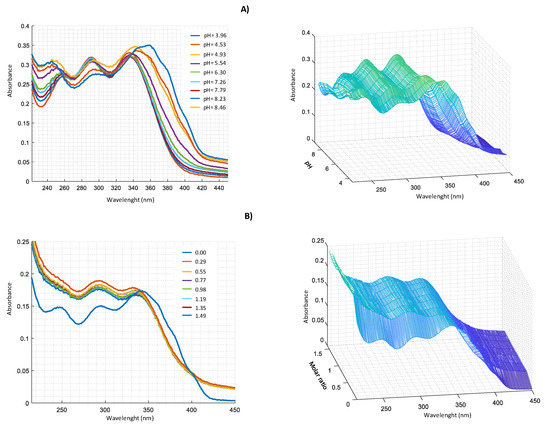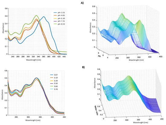 UV–VIS spectra in CH3OH/0.1 M NaClO4 (50:50 w/w) of: (A) 2.0 × 10−4 M harzianic acid and 2.0 × 10−4 M MnCl2 at different pH (3.55, 4.65, 6.30, 7.31, 8.53); (B) at different metal/harzianic acid molar ratio (0.70, 0.19, 0.39, 0.50, 0.60, 0.78) at pH = 6.50 (left 2D–right 3D graphics).