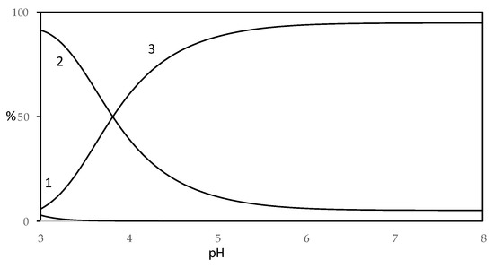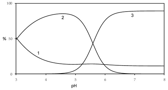 By the acid constants, it is possible to build up the distribution curves for all the species present in this system, as reported in Figure 4.