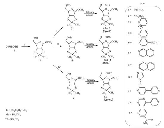 Dmochowska, B.; Ślusarz, R.; Chojnacki, J.; Samaszko-Fiertek, J.; Madaj, J. The Quaternization Reaction of 5-O-Sulfonates of Methyl 2,3-o-Isopropylidene-β-D-Ribofuranoside with Selected Heterocyclic and Aliphatic Amines. Molecules 2020, 25, 2161. https://doi.org/10.3390/molecules25092161