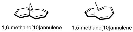 - Caramori, G.F.; de Oliveira, K.T.; Galembeck, S.E.; Bultinck, P.; Constantino, M.G. Aromaticity and Homoaromaticity in Methano[10]annulenes. J. Org. Chem. 2007, 72, 76–85. [Google Scholar] [CrossRef] [PubMed]