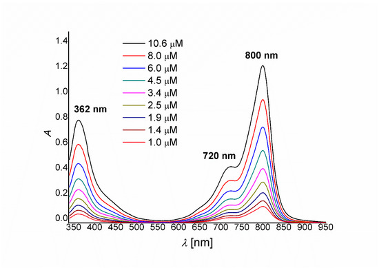 The compound 10 (diastereoisomeric mixture) was initially characterized by UV–Vis spectroscopy showing characteristic naphthalocyanine-like absorption bands at 362 and 800 nm (Figure 2). Additionally, solutions of 10 in DMF indicated good solubility up to 10 µM and apparent non-aggregation in solution, which are very important properties of highly conjugated naphthalocyanine-like dyes. This preliminary observation on non-aggregation was obtained only considering UV–Vis analysis at concentrations up to 10.6 mM in DMF, since linear increases of absorbance are achieved with increased concentrations (see Figures S56–S58 in the supporting information). However, since a mixture of diastereoisomers is present in solution, further studies are necessary to conclude about the aggregation of 10.