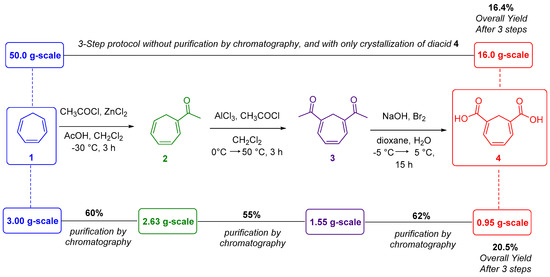 As the synthesis of annulenenitrile 9 involves eight steps we decided to scale-up some reactions in order to obtain gram-scale amounts of intermediates like 4 (Scheme 2) and 6 (Scheme 3). First, we considered the linear synthesis of 4 (Scheme 2) starting from 3.00 g of 1 and isolating each intermediate by column chromatography, thus obtaining 4 in a 0.95 g-scale (20.5% overall yield after three steps). Attempts to synthesize 4 from 1 with no intermediate purification by chromatography were performed starting from 50.0 g of cycloheptatriene (1) and, to our delight, the diacid 4 was obtained in 16.4% overall yield in a very short time. Additionally, only a simple final crystallization yielded 16.0 g of 4.