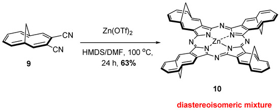 After achieving improved conditions for obtaining annulenonitrile 9 in practical amounts, we tested the first cyclotetramerization condition for obtaining the desired Zn(II)-1,6-methano[10]annulenecyanine (10) (Scheme 4) using N,N-dimethylethanolamine (DMAE) and zinc acetate dihydrate under thermal conditions. However, the new dye 10 was obtained in only trace amounts as determined by UV–Vis spectroscopy [5,12]. Fortunately, using zinc triflate in hexamethyldisilazane (HMDS) and N,N-dimethylformamide (DMF) at 100 °C for 24 h yielded 10 in 63% yield after purification by chromatography [37].