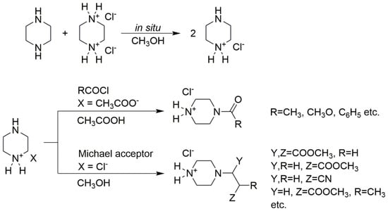 As it was described in patented procedures [46,47,48] and literature [49,50], we discovered and verified a new and simple one-pot-one-step synthetic procedure for the preparation of a large variety of monosubstituted piperazine derivatives which can now be obtained in high yields and purity while keeping costs low. The principle of the synthetic procedure (Scheme 1) is based on a reaction of in-situ formed piperazine-1-ium cation (in a form of monohydrochloride or monoacetate) with an appropriate reagent, such as acyl reagents (chlorides, anhydrides, etc.) or Michael acceptors (activated alkenes, alkynes) or others. The protonation of piperazine is employed as a simple way of protection of the secondary nitrogen atom resulting in the suppression of a competitive reaction leading to disubstituted derivatives. Although the principle of a protonated piperazine was rarely mentioned in literature [26,27,28,32], it was not applied in a broader scale for the synthesis of other monosubstituted piperazines. Nonetheless, our long-time research has shown that the principle is applicable to the synthesis of a wide range of monosubstituted piperazines. Acid/base equilibria of piperazine and some of its derivatives were studied, discussed, and published formerly [49,50] and they are considered to be an essential aspect influencing the course of the reactions. It was also discovered [46,47,48,49,50] that reactions of a protonated piperazine with different reagents are strongly influenced by metal ions which significantly accelerate the course of reactions. In particular, Cu(II) and Ce(III) ions proved to be effective catalysts for the reactions of a piperazine with electrophilic and Michael reagents because they activate reactants with lower reactivity. Disadvantages of a homogeneous catalysis were then surpassed by supporting metal ions onto polymeric resins [49,58]. As a support for metal catalysts, we used cheap, commercially available ion-exchanger polymeric resins, especially resins of a weakly acidic macroporous polyacrylate type. The supporting of metal onto polymeric resin is simply performed by treatment of a polymeric resin with a solution of a relevant metal containing compound. Supported metal ions evidence the same catalytic activity but heterogeneous catalysts can be easily separated from a reaction mixture by filtration, and when washed thoroughly, they can be reused several times without a loss of activity.