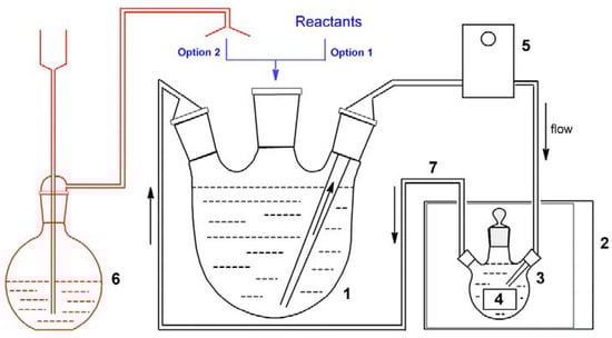 The first set-up of a microwave flow reactor prototype (procedure C) is presented in Scheme 2. When employing a flow reactor, a solution containing piperazine-1-ium cation is first poured into the reservoir flask (1) through the third neck (Option 1). A supported metal catalyst is loaded into a small three-neck reaction flask (3) placed in the MW oven (2). A catalyst is with advantage closed in a catalytic bed (4), not to be carried away from the reaction flask by a circulating mixture. A catalytic bed was realized simply by putting beads of a supported catalyst into a closed porous pouch made of polypropylene. At the advanced level, a catalytic bed can be realized as a casing made of highly porous sintered glass material. An input and output hosepipe, connecting the reaction flask with other parts, is passed through the hole in the upper wall of the oven. A silicone tubing (7) was used to connect all the parts into a closed circuit. After this, the pump of a membrane or peristaltic type (5) is switched on and the entire flow circuit (drawn in black color on Scheme 2) is filled with a solution containing piperazine-1-ium cation. Subsequently, the second starting compound is added into the circulating solution using the third neck of a reservoir flask (Option 1). A portion-wise addition of a compound is recommended to avoid a possible turbulent reaction which may occur when starting compounds are mixed together. A reservoir flask is then attached (Option 2) to a safety auxiliary system (drawn in red color on Scheme 2) including safety flask (6), balancing the pressure fluctuation in a flow circuit. After this, the MW oven is to be switched on to initiate the reaction. When using a MW oven, the MW power was always decreased and applied using a pulse mode to keep a reaction mixture in a reaction flask only slightly boiling. The MW irradiation was finished when the conversion of a reaction was full or highest, as it was monitored by thin layer chromatography (TLC). However, the flow reactor can be operated in a simple flow mode when MW heating is not required, as it was in the case of the reaction of methyl chloroformate. The reaction proceeds at room temperature when the reaction solution flows through the reaction flask equipped with a catalytic bed (MW heating was switched off during the course of the reaction). Similarly, only microwave heating without a catalytic bed can be used in the case of uncatalyzed reactions.