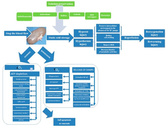 During cold ischemia time, the organ is usually stored by simple hypothermia (SCS, simple cold storage) or constant perfusion through the renal vessels using a pump. Hypothermic machine perfusion (HMP) is most commonly used for kidneys from expanded criteria donors and donors after cardiac arrest. The kidneys are cooled to +4 °C, rinsed, and then stored in a cold preservation solution until their implantation into the recipients [15,16]. Ischemic injury deepens during preservation and its severity depends on the applied storage method, solution and ischemic time. In hypothermia, renal filtration decreases proportionally with decreasing temperature. The oxidative phosphorylation process in mitochondria decreases and oxygen consumption falls. Sodium-potassium and calcium-magnesium pumps become inefficient, which results in cell oedema. The concentration of lactates and hydrogen ions increases, which acidifies the intracellular environment. The synthesis of ATP compounds is inhibited. Phosphate residues become detached, resulting in the formation of adenosine, a source of hypoxanthine that accumulates in the cell. Xanthine dehydrogenase, which acts as an oxidase, i.e., oxidizes hypoxanthine to xanthine and uric acid, undergoes transformation. Free superoxide radicals are generated. They damage the structure of structural proteins and enzymes and induce the production of inflammatory mediators. The cell membrane is destabilized as a result of lipid peroxidation [14,17,18,19].