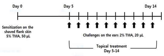 Experimental schedule of a TMA-induced AD-like mouse model. After sensitization of BALB/c mice by exposing them to 5% TMA (50 μL) on the shaved flank on Day 0, an AD-like symptom was induced on the ears of the mice by exposing them to 2% TMA (20 μL) on Days 5 to 14 daily. Piperine (2 and 4 mg/mL) or dexamethasone (10 μg/mL) was topically applied on Days 5 to 14 daily 1 h before TMA exposure.