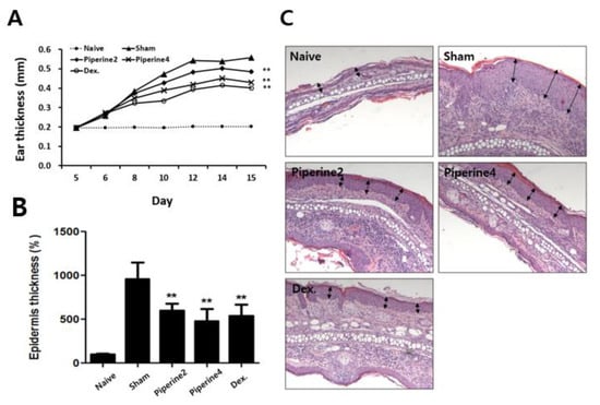To evaluate the anti-AD effects of piperine, we used a TMA-induced AD-like mouse model by modifying the methods of previous studies [28,68]. BALB/c mice (female, 6-week-old) were divided into five groups: the naïve group (naïve, n = 7), the only TMA-treated group (sham, n = 10), the TMA and 2 mg/mL piperine-treated group (Piperine2, n = 10), the TMA and 4 mg/mL piperine-treated group (Piperine4, n = 10), and the TMA and 10 μg/mL dexamethasone-treated group (Dex., n = 8). The mice were sensitized with 50 μL of 5% TMA in a mixed solvent (acetone/isopropyl myristate, 4:1 v/v) on their shaved right flank on day 0, and 20 μL of 2% TMA were then repeatedly applied to the dorsal surface of both ears from day 5 to 14 daily (Figure 1). Piperine or dexamethasone (20 μL) was topically applied daily from day 5 to 14. Ear thickness was measured at 24 h after TMA treatment using a custom-built micrometer (Schering AG, Berlin, Germany). The mice were sacrificed on day 15 (Figure 1).