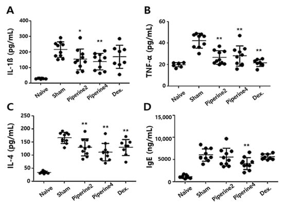 Effect of piperine on TMA-induced inflammatory cytokines and allergic responses. Production of (A) IL-1β, (B) TNF-α, and (C) IL-4 cytokines in the ear and (D) IgE levels in the serum were analyzed using ELISA. The results are shown as the means ± SD (Naïve, n = 7; Sham, Piperein2 and 4, n = 10; Dex., n = 8). Asterisks (*) and (**) indicate significant differences between piperine-treated groups and sham groups of TMA-induced AD-like mice at p < 0.05 and p < 0.01, respectively.