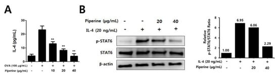 Effect of piperine treatment on IL-4 production in OVA-immunized splenocytes and on IL-4-mediated STAT6 phosphorylation in CD4+ T cells. (A) For the analysis of IL-4 cytokine production, the splenocytes isolated from OVA-immunized BALB/c mice were seeded to 5 × 106 cells/mL and cultured in the presence or absence of OVA (100 μg/mL) with piperine. (B) To detect STAT6 phosphorylation, CD4+ T cells isolated from splenocytes of a BALB/c mouse were pre-treated with piperine for 1 h before IL-4 (20 ng/mL) treatment for 15 min. The results are shown as the means ± SD (n = 3). Asterisks (**) indicate significant differences between the piperine-treated and non-treated groups at p < 0.01.