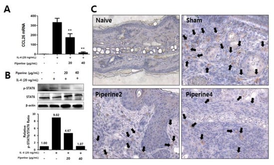 Effects of piperine on TMA-induced infiltration of CCR3+ cells in mouse ear tissues and IL-4-induced CCL26 mRNA expression and STAT6 phosphorylation in HaCaT cells. HaCaT cells pre-incubated with piperine were stimulated with IL-4 for 15 min and then incubated for 24 h to analyze (A) CCL26 mRNA expression and (B) STAT6 phosphorylation relatively. (C) Infiltration of CCR3+ cells into ear tissue was observed by immunohistological analysis. Black arrows indicate CCR3+ cells. The results are shown as the means ± SD (n = 3). Asterisks (**) indicate significant differences between the piperine-treated and non-treated groups at p < 0.01.