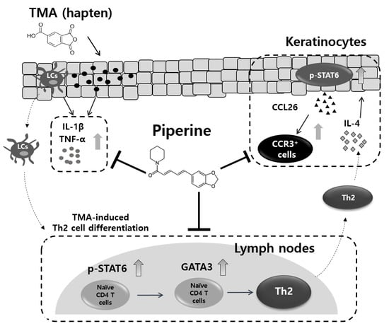 In particular, STAT proteins, as upstream regulators of transcriptional factors such as GATA3, T box transcription factor T-bet, retinoid-related orphan receptor (ROR)γt, and forkhead transcription factor Foxp3 in CD4+ T cells, are key factors to regulate differentiation of naïve CD4+ T cells into effector CD4+ T cells, such as Th1, Th2, Th17, and Treg cells [67]. Among these T cell subsets, STAT6 is related to Th2 cells, and phosphorylation of STAT6 activates Th2-mediated immune responses. In the present study, we focused on STAT6 and found that treatment with piperine suppressed the phosphorylation of STAT6 in dLNs isolated from TMA-induced mice (in vivo), CD4+ T cells isolated from OVA-induced mouse splenocytes (ex vivo), and HaCaT cells (in vitro). In these three models, the activation of STAT6 was detected by looking at IL-4 signals. Therefore, in a future study, we will investigate how piperine acts on STAT6 or its upstream control by Janus kinases (JAKs) and IL-4R.