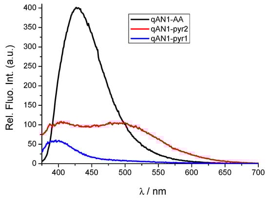 Intriguingly, the fluorescence spectrum of qAN1-pyr2 strongly differed from both qAN1-AA and qAN1-pyr1 (Figure 2). The emission of qAN1-pyr2 is characterized by two maxima: One at λmax = 400–430 nm corresponding to the qAN1-pyr1 emission and another, significantly red-shifted maximum (λmax ≈ 500 nm) of similar intensity. The qAN1 fluorophore showed similar red-shifted emission (λmax ≈ 500 nm) when incorporated in some ds-DNA oligonucleotides (Wranne et al. [16] and Figure 2) and that effect was attributed to qAN1 tautomerization in the excited state, caused by aromatic stacking interactions of qAN1 with adjacent base pairs. If the effect can be attributed to the same mechanism here that would suggest intramolecular stacking interactions between pyrene and qAN1 within one qAN1-pyr2 molecule, resulting in exciplex-type emission. Another possible reason for the appearance of the λmax at approximately 500 nm is pyrene-excimer emission [18,19,21], which is caused by two or more aromatically stacked pyrenes, thus presuming intermolecular interactions of two or more qAN1-pyr2 molecules.