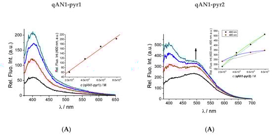 Comparison of qAN1-pyr1 and qAN1-pyr2 fluorescence spectra (λexc = 350 nm, c = 8 µM, pH 7.0, I = 0.05 M): (A) Concentration dependence of emission; (B) temperature dependence of emission. (C) Schematic presentation of intramolecular organization of qAN1-pyr1 and qAN1-pyr2 according to UV/Vis and fluorimetric data (supported by preliminary energy-minimization done in vacuum, Suppl. Info., Figure S19).
