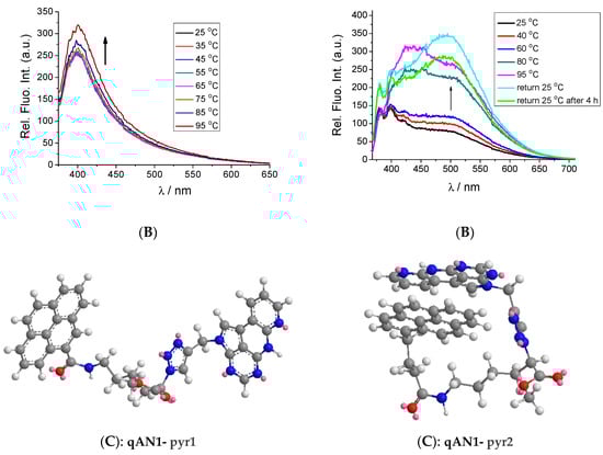Moreover, the heating of the qAN1-pyr2 solution at high concentration (8 µM) resulted in a strong increase in the emission at λmax = 495 nm (Figure 3B right). Returning to room temperature only partially restored the spectrum, even after four hours. This agrees well with the corresponding heating UV/Vis experiment (Suppl. Info. Figure S3); both UV/Vis and fluorescence results suggesting molecule aggregation/colloidization. The heating-induced aggregation is a well-known phenomenon for non-polar molecules and particularly hydrocarbons in aqueous solutions [43]. Thus, our results suggest that qAN1-pyr2 at concentrations < 2 µM is mostly present in the intramolecularly stacked form, whereas at higher concentrations (>2 µM) or upon heating intermolecular dimers or larger aggregates are formed by stacking of pyrene chromophores, resulting in additional pyrene excimer emission (Figure 3B right).