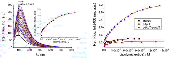 (Left): Fluorimetric titration of qAN1-pyr2 (c = 1 × 10−6 M; λexc = 350 nm) with poly (dAdT)2; (Right): Titrations with ds-DNA/RNA at λem = 495 nm. Performed in sodium cacodylate buffer (pH 7, I = 0.05 M) at room temperature.