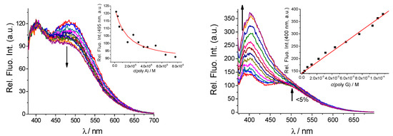 Fluorimetric titration of qAN1-pyr2 (c = 1 × 10−6 M; λexc = 350 nm) with: (Left): poly A, Inset: emission change at 495 nm; (Right): poly G, Inset: emission change at 408 nm. Performed in sodium cacodylate buffer (pH 7, I = 0.05 M).