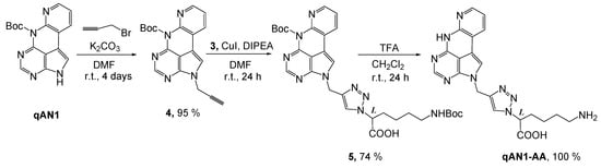 In this work, we report the development of a synthetic strategy towards multifunctional ligands for DNA and RNA, which contain the adenine analogue qAN1 linked to amino acid conjugates. Among various possibilities to attach the qAN1 to an amino acid side chain, we opted for a copper-catalyzed alkyne-azide cycloaddition (CuAAC) approach, since this “click” chemistry approach is well established for the preparation of 1,4-disubstituted-1,2,3-triazoles [22,23,24,25,26,27,28,29,30,31,32,33,34,35,36]. This approach would allow qAN1 to be attached to the amino acid side-chain prior to or after peptide construction, depending on synthetic strategy. Furthermore, triazole units are often able to interact favorably with biological targets (DNA/RNA, proteins) through hydrogen bonding, dipole-dipole and π–π stacking interactions [37,38,39,40].