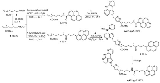 The same “click” protocol was used for the synthesis of the qAN1-amino acid-pyrene conjugates qAN1-pyr1 and qAN1-pyr2 (Scheme 4).