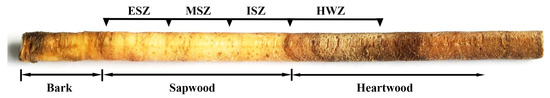 - Kampe, A.; Magel, E. New insights into heartwood and heartwood formation. In Cellular Aspects of Wood Formation; Springer: Berlin, Germany, 2013; pp. 71–95. [Google Scholar] [CrossRef]