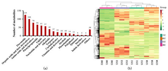 The total ion current (TIC) plot of one QC sample shows the summed intensity of all ions in the mass spectrum at different time points (Figure S1a). The stacking diagram of the TIC plot from QC mass spectrometry (Figure S1b) and the TIC curve of the metabolites showed high overlap, thus demonstrating data repeatability and reliability. The multipeak detection plot of metabolites in multiple reaction monitoring (MRM) mode shows the ion current plot of multiple substances (Figure S1c). In the MRM plot, each mass spectrum peak in a different color represents a detected metabolite. A total of 691 metabolites were detected, including: 125 flavonoids, 100 organic acids and derivatives, 78 amino acids and derivatives, 66 phenylpropanoids, 61 lipids, 57 nucleotides and derivates, 40 alkaloids, 27 terpenes, 22 carbohydrates, 18 vitamins and derivatives, 18 alcohols, 14 phenolamides, 11 polyphenols, six quinones, five sterides, five indole derivatives, and 38 others (Table S1, Figure 2a). In the clustering heat map, the accumulation of metabolites displayed clear phenotypic variation in terms of the pattern of metabolite abundance in different tissues, and the HWZ was clearly distinct from the SWZs (ISZ, MSZ, and ESZ) (Figure 2b).
