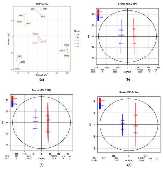Differential metabolite analysis using principal component analysis (PCA) and orthogonal projections to latent structures-discriminant analysis (OPLS-DA). (a) PCA score plots. (b–d) OPLS-DA model plots for the comparison groups HWZ vs ISZ (b), HWZ vs MSZ (c), and HWZ vs ESZ (d).