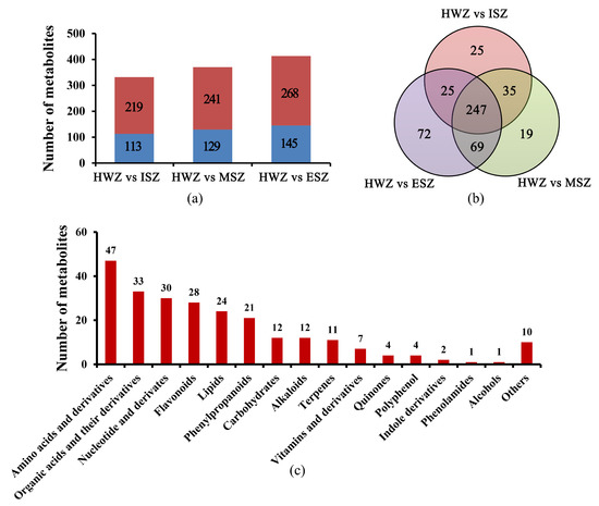 The differential metabolites analysis. (a) The number of differential metabolites between ISZ, MSZ, ESZ, and HWZ, respectively. Red pillars represent up-regulated differentially expressed metabolites; Blue pillars represent down-regulated differentially expressed metabolites. (b) The Venn diagram of differential metabolites of the comparison groups HWZ vs. ISZ, HWZ vs. MSZ, and HWZ vs. ESZ, respectively. (c) Number of different types of differential metabolites.