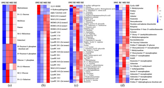 The differential primary metabolites analysis between ISZ, MSZ, ESZ, and HWZ. (a) carbohydrates, (b) amino acids, (c) lipids, and (d) nucleotides. Ratios of fold changes are given by shades of red or blue colors. Data represent mean values of three biological replicates for each sample.