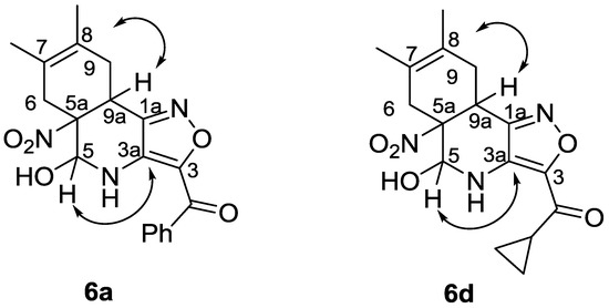 The structure of cycloadducts 6 was proved by 2D NMR spectroscopy experiments (COSY, 1H-13C HMBC, 1H-13C HSQC). For compounds 6a and 6d, the full assignment of hydrogen and carbon atoms in the NMR spectra was made. NMR experiments confirmed the proposed addition of a diene at the C=C(NO2) bond, Figure 4.
