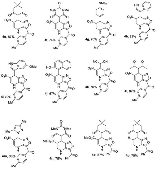 We studied the interaction of isoxazolo[4,3-b]pyridines 3 with neutral C-nucleophiles: CH acids and π-excessive (het)arenes. It was found that nitro derivatives 3a–d react with all ranges of used nucleophiles under mild conditions (MeCN, room temperature, base-free), forming 1,4-addition products, 4a–m, Scheme 3. As in the case of A [45], β-dicarbonyl compounds react with 3 in enolic form. The reaction rate was similar to that of superelectrophiles A and B [45,46] (Scheme 1), thus indicating the high electrophilicity of isoxazolo[4,3-b]pyridine system. Some of the reactions proceeded almost immediately after mixing the reagents, the others were completed within an hour.