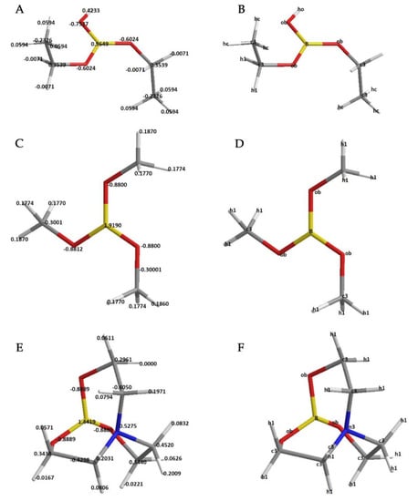 Electrostatic potential (ESP) charges (a.u.) and assigned atom types for molecules. (A,C,E) show ESP charges for diethoxyboronic acid, IVEKAW02, and TEAMBO04, respectively. (B,D,F) show assigned atom types in the same order.