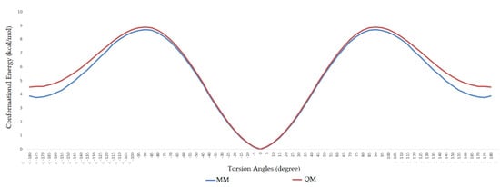As a previously mentioned, the power of the molecular dynamics parameters is that it can reproduce experimental data. When the force-field studies in the literature were examined, the values of RMSD-AD (atomic displacement), RMSD-L (bond length), and RMSD-A (bond angle) for GAFF [2] increased to 0.992, 0.0477, and 4.12, respectively; the RMSD value increased to 43.8° for the MM2X out-of-plane angle [11]. If Table 3 is examined, it can be observed that RMSD-L and RMSD-A values did not exceed 0.212 and 0.039, respectively, which is in conformity with the literature [2,11]. Table 4 shows the calculated numbers, denoted inside the parentheses, where out-plane numbers are not included. It can be observed that these values did not exceed 3.381 and remained below 4.12. According to these results, our novel parameters are able to reproduce experimental data reasonably well, and they confirmed the reliability of bond and angle parameters by reproducing geometry very close to the X-ray structure. In addition, the reliability of the parameters produced by the Seminario method was already proven many times in the literature. It is also clear from Figure 2 and Figure 3 that the molecular mechanics potential energy surface (PES) scan for dihedrals satisfactorily reproduced the corresponding PES using the B3LYP/6,311G ++ (2d, 2p) basis set. Additionally, IWEKAW02 started to stabilize after 28 ns, whereas TEAMBO04 maintained its initial stable state (Figure 4 and Figure 5). Therefore, it can be suggested that the molecular dynamics production was obtained successfully with our novel parameters.