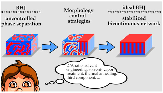 Based on the above classification, we can distinguish three main lines of the current OPV research: molecular design, interface engineering, and morphology control. Despite the astonishing progresses achieved in the last years, through innovative molecular design and interface engineering strategies, it is widely believed that optimized BHJ morphologies and nanoscale control hold the key to the design of commercially viable OSCs [94,95,96,97,98]. The controlled formation of a fine BHJ nanostructure that resembles the ideal one and that does not evolve with time is a key requirement for an efficient and stable OPV-technology. D- and A-materials should be judiciously chosen for this purpose, but there are several other parameters influencing the topology of the D/A-I. The selection of an appropriate host solvent, the use of solvent mixtures, screening of different ratios and concentrations of the blend components, thermal annealing, and solvent-vapor treatment [99] are among the most reported approaches that have been developed to gain control over the active layer morphology.