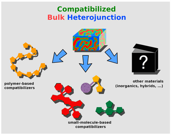 CBs are widely described in the literature, although often with ambiguous terminology. A deep analysis of scientific reports reveals that “additives”, “modulators”, and “nanostructuring agents” are used, as well as, more rarely, “dopants”; in some borderline cases, ternary OPVs simply correspond to binary D/A systems with a CB. The aim of this review is to provide the reader with a satisfying overview of the most recent and representative approaches targeting at the generation of optimal D/A-I by means of a minority molecular/polymeric component, able to create an interface compatible with both the given donor and acceptor materials, hence to act as an effective compatibilizer.