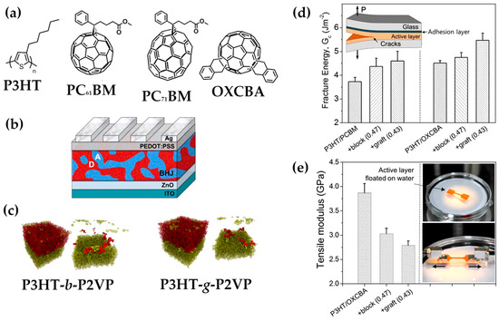 Poly(vinylpyridine)-based CBs. (a) Chemical structures of the polymer electron donor (P3HT) and fullerene-derivative electron acceptors (OXCBA, PCBM, and PC71BM). (b) Scheme of the inverted solar cell. (c) Models for the molecular configurations at the D/A interfaces for the poly(3-hexylthiophene)-block-poly(2-vinylpyridine) (P3HT-b-P2VP) and the poly(3-hexylthiophene)-graft-poly(2-vinylpyridine) (P3HT-g-P2VP). Effect of the P3HT-b-P2VP and P3HT-g-P2VP on (d) fracture energy and (e) tensile modulus of P3HT:PCBM and P3HT:OXCBA BHJ films. Reprinted with permission from Reference [135]. Copyright 2014 American Chemical Society.